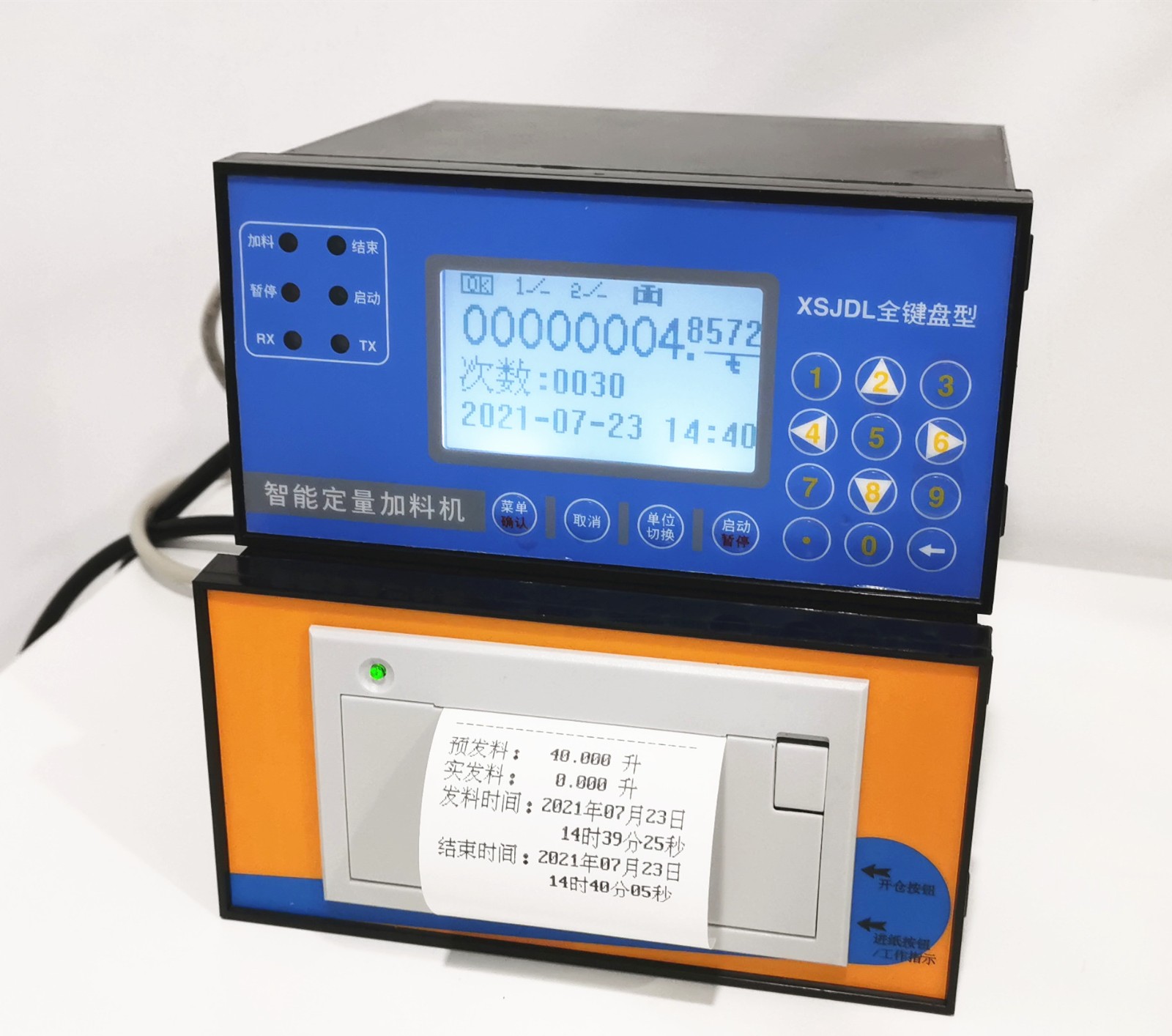 定量控制仪带微型打印机,打印小票方式可以选择:发料结束可以自动打印小票或是选择打印小票。